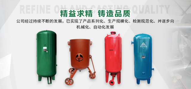 本企業產品有眾多產品分類,儲氣罐、磨料桶、碳鋼儲氣罐、不銹鋼儲氣罐、中高壓儲氣罐、臥式儲氣罐、緩沖罐、隔膜罐、噴砂罐、分氣缸、以及其他的定做非標產品等,產品廣泛應用于化工、制藥、橡膠、石油、食品、機械等行業。